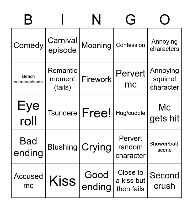 This bingo card has a free space and 24 words: Blushing, Kiss, Firework, Accused mc, Annoying characters, Comedy, Beach scene/episode, Carnival episode, Hug/cuddle, Crying, Pervert mc, Eye roll, Pervert random character, Shower/bath scene, Romantic moment (fails), Close to a kiss but then fails, Mc gets hit, Moaning, Annoying squirrel character, Tsundere, Second crush, Bad ending, Confession and Good ending.