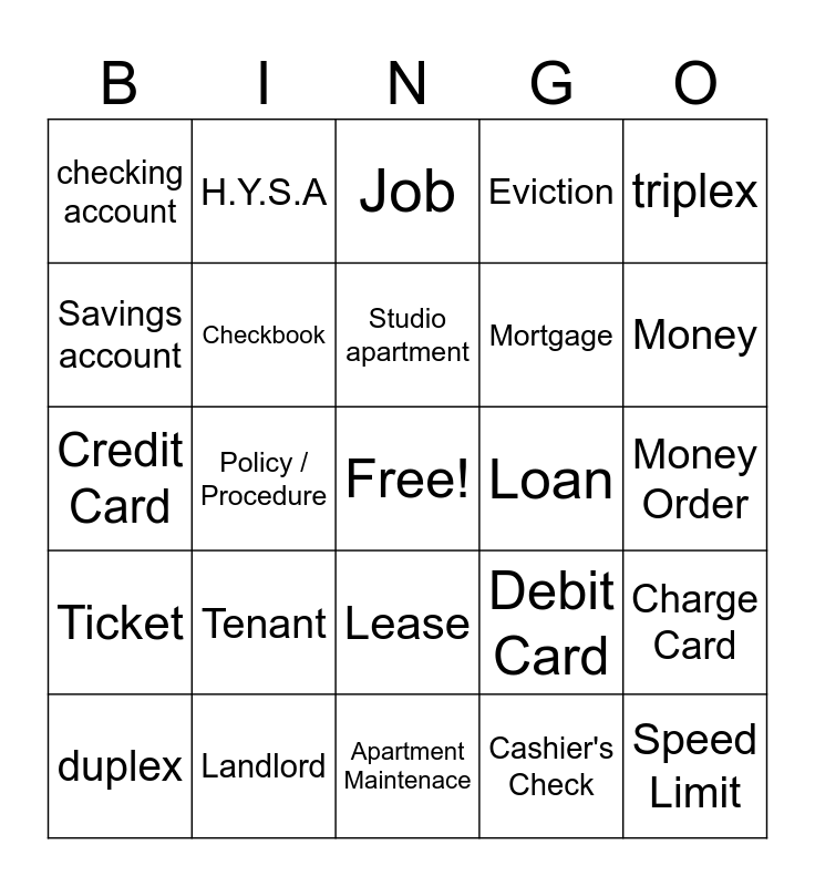 This bingo card has a free space and 24 words: Tenant, Landlord, Studio apartment, duplex, triplex, checking account, Savings account, H.Y.S.A, Loan, Lease, Mortgage, Credit Card, Debit Card, Charge Card, Checkbook, Cashier's Check, Money Order, Job, Money, Policy / Procedure, Speed Limit, Ticket, Eviction and Apartment Maintenace.
