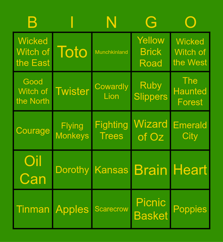 This bingo card has 25 words: Dorothy, Scarecrow, Cowardly Lion, Tinman, Wicked Witch of the West, Wicked Witch of the East, Good Witch of the North, Toto, Wizard of Oz, Kansas, Ruby Slippers, Courage, Brain, Heart, Twister, Poppies, Emerald City, Munchkinland, The Haunted Forest, Flying Monkeys, Fighting Trees, Apples, Oil Can, Yellow Brick Road and Picnic Basket.