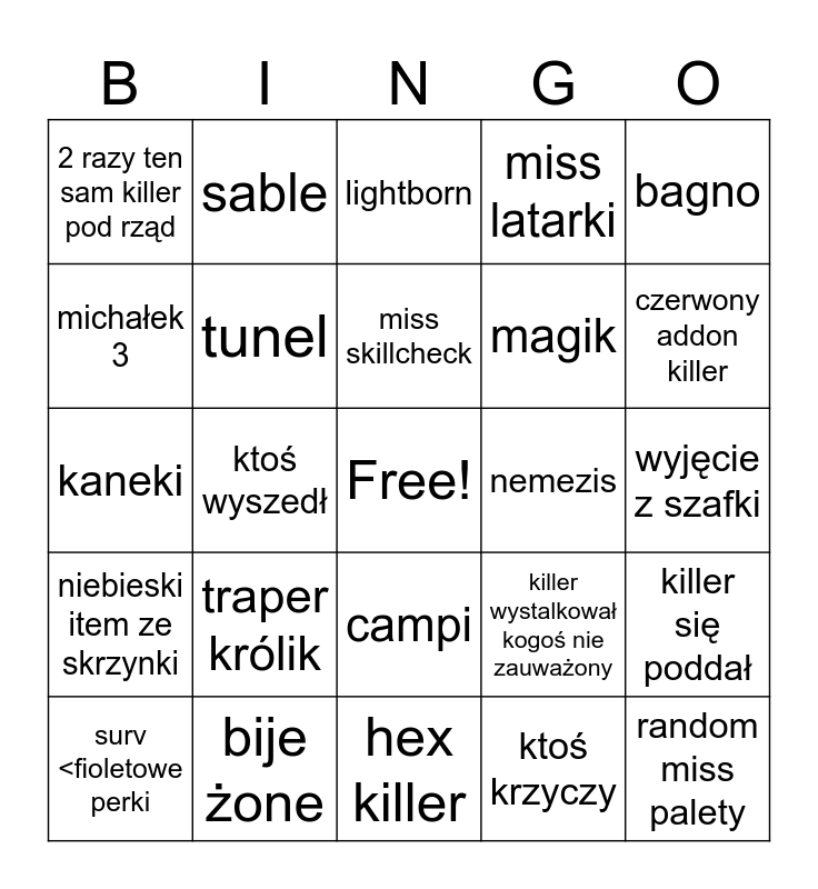 This bingo card has a free space and 40 words: mori, kaneki, the game, tunel, bije żone, campi, miss skillcheck, bluetooth hit, bagno, niebieski item ze skrzynki, ktoś wyszedł, miss latarki, random miss palety, wyjęcie z szafki, nemezis, traper królik, huntress, 2 razy ten sam killer pod rząd, russian federation, lightborn, killer się poddał, ktoś krzyczy, magik, michałek 3, ślepy killer, hatch surv, hatch killer, niemiec z gazem, tryhard, prywatne konto, killer <fioletowe perki, surv <fioletowe perki, buba, killer wystalkował kogoś nie zauważony, czerwony addon killer, hex killer, hex surv, pentagram, sable and gas.