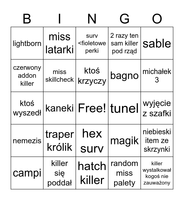 This bingo card has a free space and 40 words: mori, kaneki, the game, tunel, bije żone, campi, miss skillcheck, bluetooth hit, bagno, niebieski item ze skrzynki, ktoś wyszedł, miss latarki, random miss palety, wyjęcie z szafki, nemezis, traper królik, huntress, 2 razy ten sam killer pod rząd, russian federation, lightborn, killer się poddał, ktoś krzyczy, magik, michałek 3, ślepy killer, hatch surv, hatch killer, niemiec z gazem, tryhard, prywatne konto, killer <fioletowe perki, surv <fioletowe perki, buba, killer wystalkował kogoś nie zauważony, czerwony addon killer, hex killer, hex surv, pentagram, sable and gas.