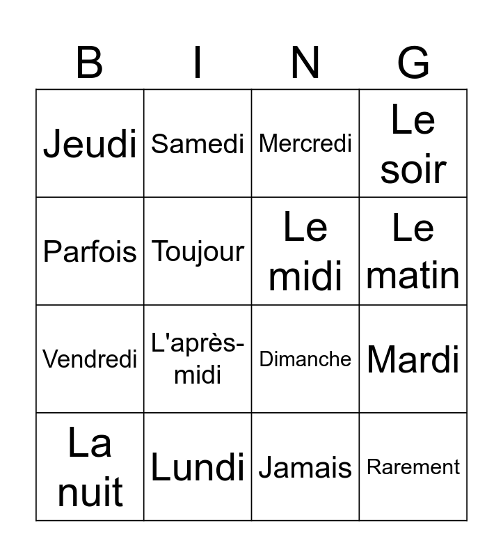 This bingo card has 16 words: Lundi, Mardi, Mercredi, Jeudi, Vendredi, Samedi, Dimanche, Jamais, Parfois, Toujour, La nuit, Le soir, L'après-midi, Le matin, Le midi and Rarement.