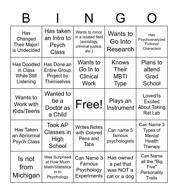 This bingo card has a free space and 24 words: Took AP Classes in High School, Was Surprised at How Much Math/Statistics in in Psychology, Wants to Go In to Clinical Work, Is not from Michigan, Has Psychoanalyzed Fictional Characters, Has Changed Their Major/ is Undecided, Has Doodled in Class While Still Listening, Has taken an Intro to Psych Class, Plays an Instrument, Writes Notes with Colored Pens and Tabs, Knows Their MBTI Type, Wants to Work with Kids/Teens, Can name 5 famous psychologists, Can Name 3 Types of Mental Health Therapy, Has Done an Entire Group Project by Themselves, Has owned a pet that was NOT a cat or a dog, Loved/Is Excited About Taking Rat Lab, Wants to minor in a related field (sociology, criminal justice, etc.), Plans to attend Grad School, Wanted to be a Doctor as a Child, Can Name all the "Big Five" Personality Traits, Has Taken an Abnormal Psych Class, Wants to Go Into Research and Can Name 3 Famous Psychology Experiments.