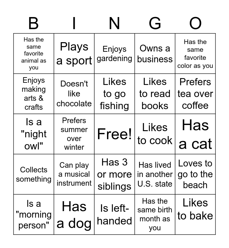 This bingo card has a free space and 24 words: Can play a musical instrument, Has a dog, Likes to go fishing, Is a "morning person", Has the same favorite color as you, Has the same favorite animal as you, Enjoys making arts & crafts, Plays a sport, Likes to cook, Has 3 or more siblings, Likes to read books, Is a "night owl", Has lived in another U.S. state, Loves to go to the beach, Doesn't like chocolate, Has the same birth month as you, Has a cat, Enjoys gardening, Prefers tea over coffee, Prefers summer over winter, Likes to bake, Collects something, Owns a business and Is left-handed.
