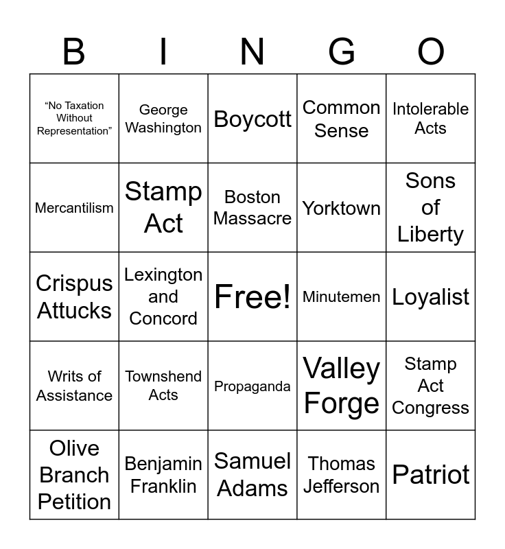 This bingo card has a free space and 37 words: The French and Indian War, The Proclamation of 1763, Sugar Act, Stamp Act, Stamp Act Congress, Townshend Acts, Boston Massacre, Tea Act, Intolerable Acts, 1st Continental Congress, Lexington and Concord, Common Sense, Patriot, Loyalist, Mercantilism, Writs of Assistance, Militia, Boycott, Propaganda, Minutemen, “No Taxation Without Representation”, Sons of Liberty, Olive Branch Petition, Samuel Adams, John Adams, Thomas Jefferson, George Washington, Paul Revere, Patrick Henry, Thomas Paine, King George III, Benjamin Franklin, Crispus Attucks, Battle of Saratoga, Valley Forge, Yorktown and Treaty of Paris.
