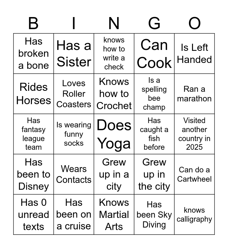 This bingo card has 47 words: Took Dance Lessons, Does Yoga, Played Intramural Sand Volleyball, Knows Martial Arts, Wears Contacts, Has a Brother, Has a Sister, Can Speak 2 languages, Rides Horses, Has been on a Cruise, Loves Roller Coasters, Can Cook, Can do a Cartwheel, Grew up in the city, Is an only Child, lives outside of VA, Knows how to Crochet, Has caught a fish before, Met a celebrity, Is Left Handed, Is wearing funny socks, Has been Sky Diving, Has broken a bone, Is a spelling bee champ, Is Vegetarian, Ran a marathon, Has 0 unread texts, Has 0 unread emails, Grew up in a city, Has been to Disney, Has been Skiing, Was on SGA in HS, Owns Cryptocurrency, Has 3+ dogs, Has 3+ cats, Has been on a cruise, Visited another country in 2025, Knows ASL, Has a June Birthday, Has a January Birthday, knows calligraphy, knows how to write a check, Has fantasy league team, Was a lifeguard, Favorite Holiday is Halloween, Drinks coffee everyday and Has been on OREC Trip.