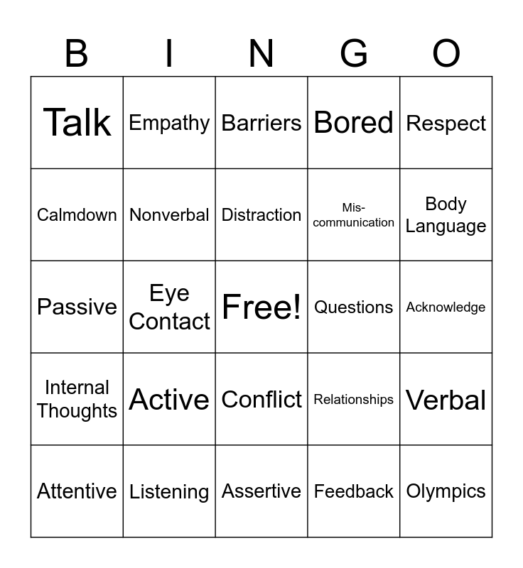 This bingo card has a free space and 24 words: Active, Listening, Distraction, Attentive, Respect, Talk, Calmdown, Empathy, Questions, Conflict, Mis- communication, Passive, Relationships, Verbal, Nonverbal, Feedback, Acknowledge, Barriers, Body Language, Eye Contact, Olympics, Internal Thoughts, Bored and Assertive.