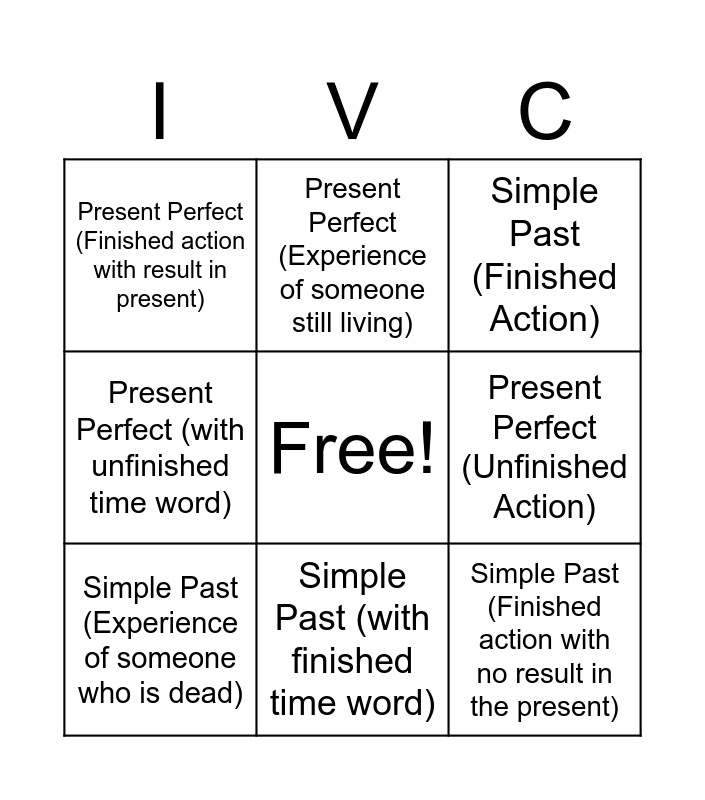 This bingo card has a free space and 8 words: Present Perfect (Unfinished Action), Simple Past (Finished Action), Present Perfect (Experience of someone still living), Simple Past (Experience of someone who is dead), Present Perfect (Finished action with result in present), Simple Past (Finished action with no result in the present), Present Perfect (with unfinished time word) and Simple Past (with finished time word).