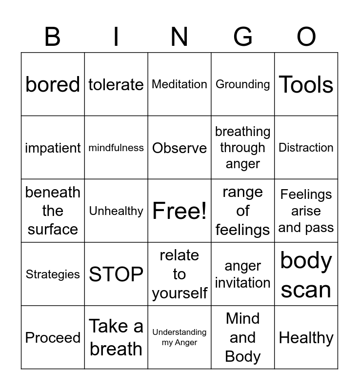 This bingo card has a free space and 24 words: STOP, Take a breath, Observe, Proceed, Tools, bored, impatient, tolerate, range of feelings, relate to yourself, breathing through anger, beneath the surface, anger invitation, body scan, mindfulness, Mind and Body, Feelings arise and pass, Meditation, Distraction, Unhealthy, Healthy, Strategies, Grounding and Understanding my Anger.