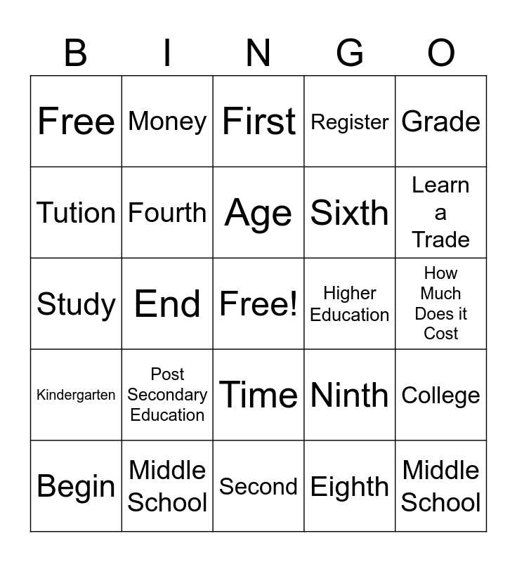 This bingo card has a free space and 29 words: Immigrant, Middle School, First, Fifth, Grade, Free, Fourth, Age, Higher Education, College, Begin, End, Eighth, Middle School, Study, Public School, Second, Ninth, Learn a Trade, Kindergarten, Post Secondary Education, Third, Sixth, How Much Does it Cost, Tution, Money, Time, Register and Financial Aid.