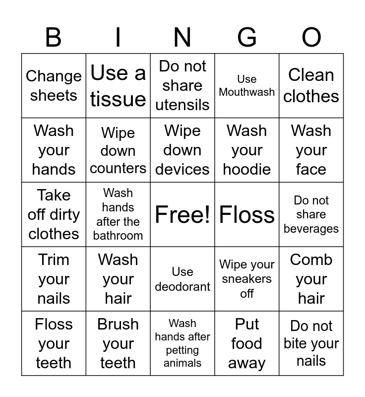 This bingo card has a free space and 24 words: Wash your hair, Brush your teeth, Wipe down devices, Floss your teeth, Clean clothes, Change sheets, Wash your hands, Use a tissue, Floss, Use deodorant, Wash your hoodie, Take off dirty clothes, Wipe your sneakers off, Comb your hair, Wipe down counters, Put food away, Do not share beverages, Do not share utensils, Wash your face, Wash hands after the bathroom, Do not bite your nails, Trim your nails, Use Mouthwash and Wash hands after petting animals.