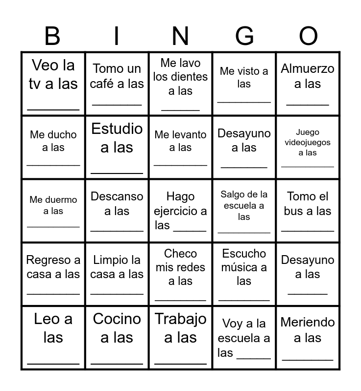 This bingo card has 25 words: Limpio la casa a las ________, Trabajo a las ______, Me levanto a las _________, Leo a las ______, Almuerzo a las ______, Veo la tv a las ______, Me ducho a las _________, Tomo un café a las _______, Salgo de la escuela a las __________, Checo mis redes a las ________, Desayuno a las _______, Me duermo a las __________, Escucho música a las ________, Desayuno a las ______, Estudio a las ______, Meriendo a las _______, Tomo el bus a las ________, Me lavo los dientes a las ______, Juego videojuegos a las ___________, Descanso a las ________, Hago ejercicio a las _____, Cocino a las ______, Regreso a casa a las ________, Me visto a las _________ and Voy a la escuela a las _____.