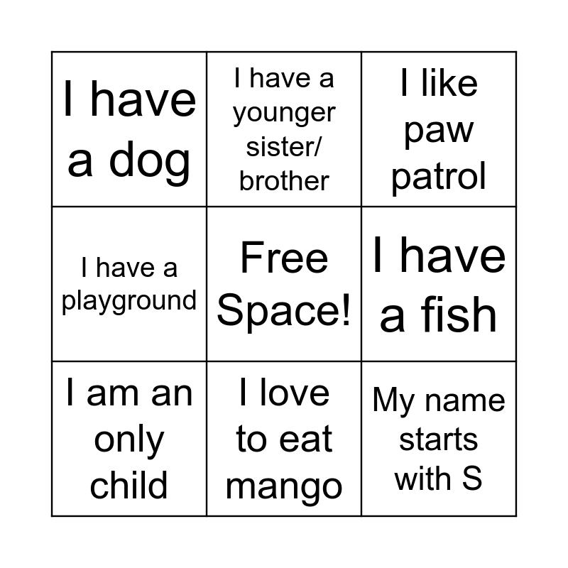This bingo card has a free space and 22 words: My favorite color is Green, I have an older brother/ sister, I have a younger sister/ brother, I love to swim, I have a fish, I am an only child, I have a dog, I like paw patrol, I wear glasses, I love broccoli, I want to be an astronaut, I have a playground, I am the youngest in my family, I am kind, I have brown hair, I have black hair, My brothers name starts with an A, I learn dance, I can play piano, My name starts with S, I love to eat mango and I like to bake.