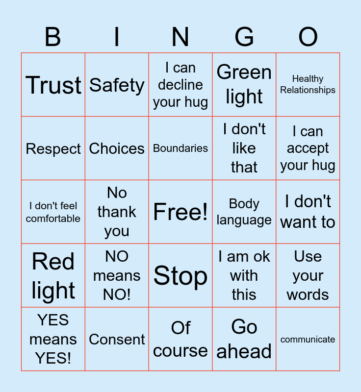 This bingo card has a free space and 24 words: NO means NO!, Consent, Boundaries, YES means YES!, Healthy Relationships, Trust, Respect, Safety, Body language, Stop, I don't like that, I don't feel comfortable, I am ok with this, Use your words, Choices, Go ahead, I don't want to, I can decline your hug, I can accept your hug, No thank you, communicate, Red light, Green light and Of course.