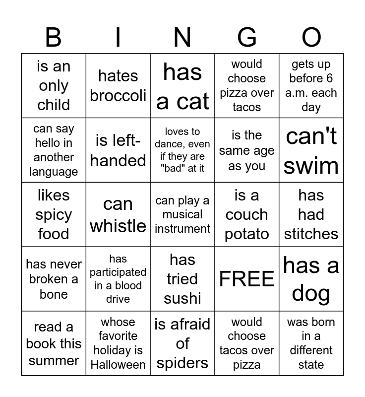 This bingo card has 25 words: has participated in a blood drive, is afraid of spiders, loves to dance, even if they are "bad" at it, read a book this summer, gets up before 6 a.m. each day, is an only child, can say hello in another language, hates broccoli, is a couch potato, has tried sushi, is the same age as you, likes spicy food, FREE, has a dog, is left-handed, was born in a different state, has had stitches, has a cat, can't swim, can whistle, can play a musical instrument, whose favorite holiday is Halloween, has never broken a bone, would choose pizza over tacos and would choose tacos over pizza.