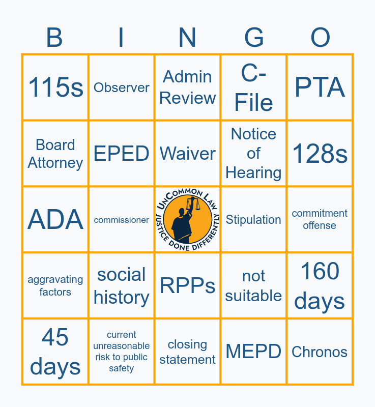 This bingo card has a free space and 60 words: parole, current unreasonable risk to public safety, mitigating factors, aggravating factors, MEPD, YPED, EPED, Consultation, Notice of Hearing, Olson review, C-File, CRA, Board Attorney, Probation Report, Court of Appeal Opinion, 115s, Chronos, PTA, Postponement, Waiver, Stipulation, Admin Review, 45 days, 160 days, 3 year denial, once a year, every 3 years, 3 times, 128s, confidential information, emergency, hearing day, virtual, DA, Observer, YOU!, deputy commissioner, commissioner, CO's, ADA, check audio, social history, commitment offense, suitable, not suitable, post-conviction, discipline, programs, parole plans, RPPs, closing statement, letters of remorse, atleast 15 days before hearing, hearing day, victims, marsy's law, victim's family, elderly parole, youth parole and insight.