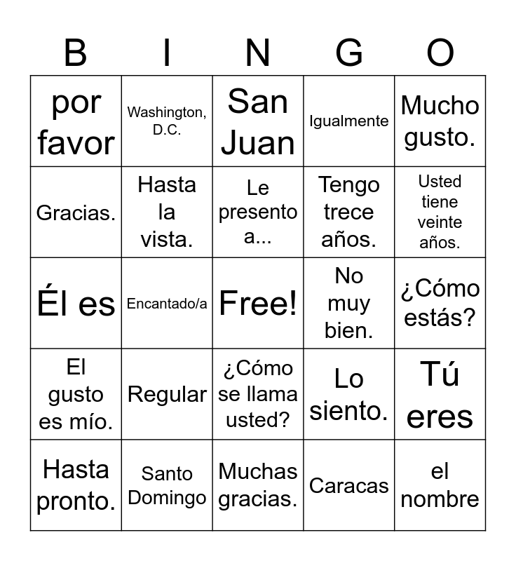 This bingo card has a free space and 39 words: Buenos días., Buenas tardes., Buenas noches., Hasta la vista., Hasta pronto., ¿Cómo se llama usted?, Le presento a..., Te presento a..., Mucho gusto., El gusto es mío., Encantado/a, Igualmente, el nombre, ¿Cómo estás?, No muy bien., Regular, ¿Qué pasa?, por favor, De nada / No hay de qué., Lo siento., Gracias., Muchas gracias., Tengo trece años., Usted tiene veinte años., Buenos Aires, Bogotá, San José, San Salvador, Madrid, Washington, D.C., La Ciudad de México, Lima, San Juan, Santo Domingo, Caracas, Yo soy, Tú eres, Él es and Nosotros somos.