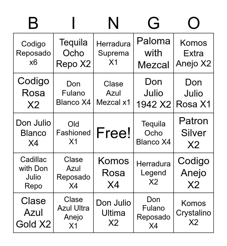 This bingo card has a free space and 24 words: Clase Azul Reposado X4, Clase Azul Ultra Anejo X1, Clase Azul Mezcal x1, Clase Azul Gold X2, Komos Extra Anejo X2, Codigo Reposado x6, Codigo Rosa X2, Tequila Ocho Repo X2, Tequila Ocho Blanco X4, Komos Rosa X4, Don Julio 1942 X2, Don Julio Blanco X4, Herradura Legend X2, Codigo Anejo X2, Don Fulano Blanco X4, Don Fulano Reposado X4, Patron Silver X2, Herradura Suprema X1, Don Julio Rosa X1, Old Fashioned X1, Komos Crystalino X2, Cadillac with Don Julio Repo, Paloma with Mezcal and Don Julio Ultima X2.