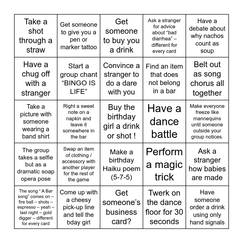 This bingo card has a free space and 28 words: Ask a stranger how babies are made, Find someone with the same name as someone in the group, Find an item that does not belong in a bar, Twerk on the dance floor for 30 seconds, Have a chug off with a stranger, Get someone to buy you a drink, Get someone to give you a pen or marker tattoo, The group takes a selfie but as a dramatic soap opera pose, Have a dance battle, The song “ A Bar song” comes on – fire ball – shots – espresso – yeah – last night – gold digger – different for every card, Take a picture with someone wearing a band shirt, Ask a stranger for advice about “bad diarrhea” – different for every card, Come up with a cheesy pick-up line and tell the bday girl, Get someone’s business card?, Belt out as song chorus all together, Start a conga line, Swap an item of clothing / accessory with another player for the rest of the game, Start a group chant “BINGO IS LIFE”, Convince a stranger to do a dare with you, Make a birthday Haiku poem (5-7-5), Take a shot through a straw, Win rock paper scissors against another team, Have someone order a drink using only hand signals, Right a sweet note on a napkin and leave it somewhere in the bar, Make everyone freeze like mannequins until someone outside your group notices., Perform a magic trick, Have a debate about why nachos count as soup and Toast to something ridiculous such as “tax forms” or “Dracula”.
