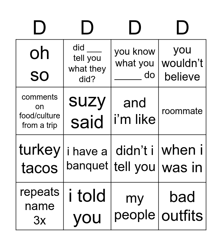 This bingo card has 16 words: i told you, when i was in, you know what you _____ do, oh so, turkey tacos, did ___ tell you what they did?, didn’t i tell you, my people, comments on food/culture from a trip, suzy said, repeats name 3x, you wouldn’t believe, i have a banquet, roommate, and i’m like and bad outfits.