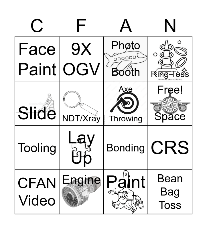 This bingo card has 10 images and 18 words: Lay Up, Bean Bag Toss, Photo Booth, Face Paint, Bonding, Ring Toss, CFAN Video, 9X OGV, Free! Space, Tooling, Paint, Slide, CRS, NDT/Xray, Axe Throwing, Machining, Engine and DSQR.