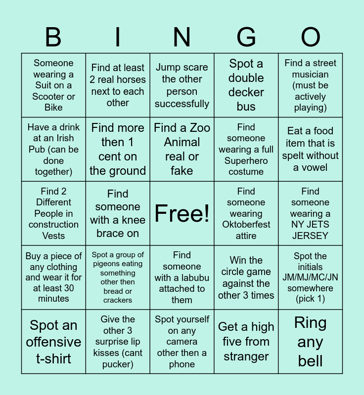 This bingo card has a free space and 24 words: Spot a group of pigeons eating something other then bread or crackers, Give the other 3 surprise lip kisses (cant pucker), Find a Zoo Animal real or fake, Spot an offensive t-shirt, Find a street musician (must be actively playing), Someone wearing a Suit on a Scooter or Bike, Have a drink at an Irish Pub (can be done together), Find at least 2 real horses next to each other, Find someone wearing Oktoberfest attire, Find someone with a labubu attached to them, Find someone wearing a full Superhero costume, Find 2 Different People in construction Vests, Win the circle game against the other 3 times, Spot the initials JM/MJ/MC/JN somewhere (pick 1), Find more then 1 cent on the ground, Get a high five from stranger, Find someone wearing a NY JETS JERSEY, Jump scare the other person successfully, Eat a food item that is spelt without a vowel, Find someone with a knee brace on, Ring any bell, Buy a piece of any clothing and wear it for at least 30 minutes, Spot a double decker bus and Spot yourself on any camera other then a phone.