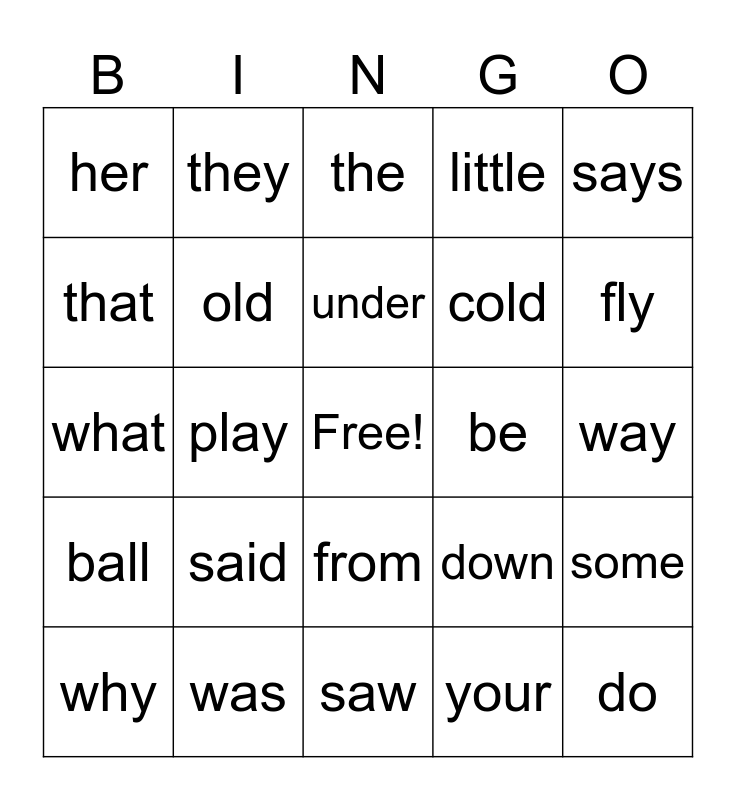 This bingo card has a free space and 24 words: said, was, under, why, says, her, that, they, be, from, cold, what, down, some, old, your, way, the, fly, play, do, ball, little and saw.