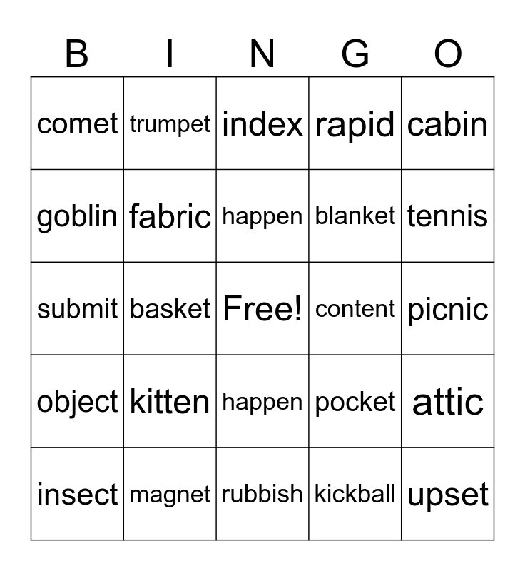 This bingo card has a free space and 29 words: insect, rocket, basket, fossil, comet, index, fabric, kitten, content, magnet, picnic, upset, rubbish, kickball, tennis, cobweb, happen, object, cabin, submit, pocket, exit, blanket, goblin, rapid, trumpet, attic, happen and frantic.