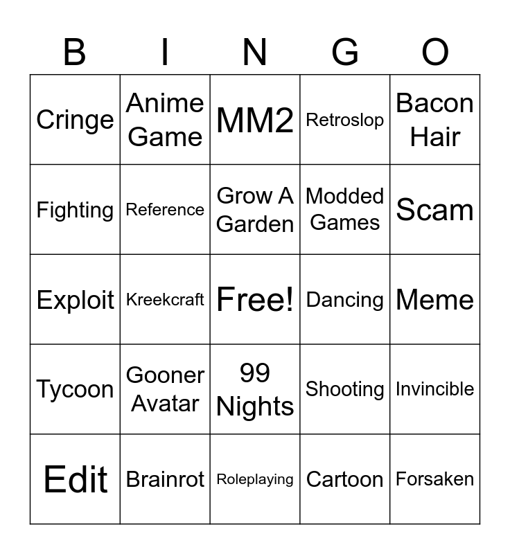 This bingo card has a free space and 24 words: Gooner Avatar, Brainrot, Grow A Garden, Edit, Bacon Hair, Cringe, Fighting, Anime Game, Dancing, 99 Nights, Modded Games, Exploit, Shooting, Invincible, Reference, Cartoon, Meme, MM2, Scam, Kreekcraft, Forsaken, Tycoon, Retroslop and Roleplaying.