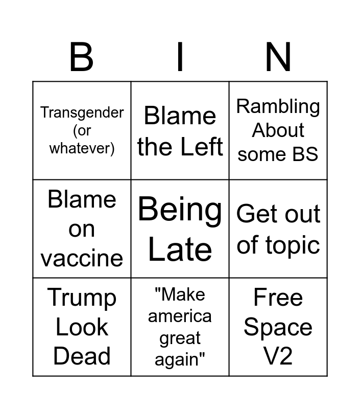 This bingo card has a free space and 9 words: Trump Look Dead, Rambling About some BS, Blame the Left, Blame on vaccine, Transgender (or whatever), Get out of topic, Free Space V2, Trump Makeup and "Make america great again".
