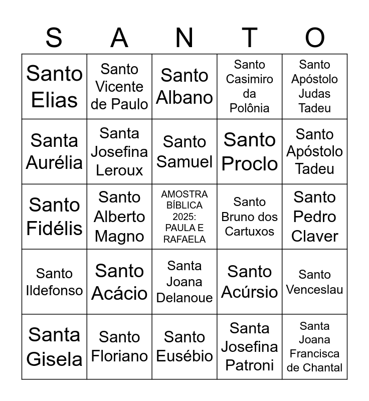 This bingo card has a free space and 492 words: Santo Abraão, Santo Abdias, Santo Abdon, Santo Abílio, Santo Abraão de Rostov, Santo Abrahão Kidunaia, Santo Abrahão de Esmirna, Santo Acácio, Santo Acúrsio, Santo Adalberto, Santo Adão, Santo Adelardo, Santo Adolfo, Santo Adriano, Santo Adauto, Santo Afraates, Santo Agápito, Santo Agatão, Santo Agostinho, Santo Agostinho de Hipona, Santo Agostinho Zhao Rong, Santo Agrícola, Santo Aidan, Santo Aidano, Santo Afonso Maria de Ligório, Santo Afonso Rodríguez, Santo Alano, Santo Albano, Santo Alberto Magno, Santo Alberto Chmielowski, Santo Alberto Hurtado, Santo Alcibíades, Santo Aldo, Santo Aleixo, Santo Alexandre, Santo Alexandre Sauli, Santo Alexandre Nevsky, Santo Alfredo, Santo Alípio, Santo Alonzo Rodríguez, Santo Ambrósio, Santo Ambrósio de Milão, Santo Ambrósio Autperto, Santo Amós, Santo Anastácio, Santo Anastácio de Antioquia, Santo Anastácio de Aquileia, Santo Anastácio II, Santo Anastácio III, Santo Anatólio, Santo André, Santo André Avelino, Santo André Corsini, Santo André Dung-Lac, Santo André Kim Taegon, Santo André Bobola, Santo Ângelo, Santo Ângelo de Jerusalém, Santo Aniano, Santo Anselmo, Santo Anselmo de Cantuária, Santo Ansgário, Santo Antão, Santo Antão do Deserto, Santo Antipas, Santo Antônio, Santo Antônio Maria Claret, Santo Antônio Maria Zaccaria, Santo Antônio de Lisboa (ou de Pádua), Santo Apolinário, Santo Apolinário de Ravena, Santo Apolinário de Valência, Santo Apóstolo João, Santo Apóstolo Paulo, Santo Apóstolo Tiago, Santo Apóstolo Bartolomeu, Santo Apóstolo Tomé, Santo Apóstolo Filipe, Santo Apóstolo Simão, Santo Apóstolo Tadeu, Santo Apóstolo Pedro, Santo Apóstolo André, Santo Apóstolo Mateus, Santo Apóstolo Judas Tadeu, Santo Apóstolo Matias, Santo Apóstolo Barnabé, Santo Apóstolo Timóteo, Santo Apóstolo Tito, Santo Apóstolo Marcos, Santo Apóstolo Lucas, Santo Arão, Santo Arcádio, Santo Arnaldo Janssen, Santo Arsênio, Santo Atanásio, Santo Atanásio de Alexandria, Santo Atílio, Santo Avito, Santo Balduíno, Santo Bartolomeu, Santo Bartolomeu dos Mártires, Santo Bartolomeu de Braga, Santo Basílio, Santo Basílio Magno, Santo Basílio de Ancira, Santo Basílio de Cesareia, Santo Beda, o Venerável, Santo Beltrão, Santo Bento, Santo Bento de Núrsia, Santo Bento José Labre, Santo Bernardino de Sena, Santo Bernardo, Santo Bernardo de Claraval, Santo Bernardo Tolomei, Santo Bertoldo, Santo Boaventura, Santo Bonifácio, Santo Bonifácio de Tarsos, Santo Bonifácio de Mainz, Santo Bráulio, Santo Brás, Santo Brás de Sebaste, Santo Bruno, Santo Bruno de Colônia, Santo Bruno dos Cartuxos, Santo Calisto I, Santo Calisto II, Santo Calisto III, Santo Cândido, Santo Carlos Borromeu, Santo Carlos Lwanga, Santo Casimiro, Santo Casimiro da Polônia, Santo Cecílio, Santo Celestino I, Santo Celestino V, Santo Cesário, Santo Cipriano, Santo Cirilo, Santo Cirilo de Alexandria, Santo Cirilo de Jerusalém, Santo Clemente, Santo Clemente de Roma, Santo Clemente Maria Hofbauer, Santo Columbano, Santo Conrado, Santo Constantino, Santo Cornélio, Santo Cosme, Santo Damião, Santo Daniel, Santo David, Santo Dionísio, Santo Domingos, Santo Domingos de Gusmão, Santo Domingos Sávio, Santo Donato, Santo Eduardo, Santo Eleutério, Santo Elói, Santo Elias, Santo Eliseu, Santo Emídio, Santo Emérito, Santo Epafrás, Santo Epifânio, Santo Estanislau, Santo Estêvão, Santo Eusébio, Santo Eusébio de Cesareia, Santo Eusébio de Vercelli, Santo Expedito, Santo Fabião, Santo Fabiano, Santo Fábio, Santo Félix, Santo Fidélis, Santo Filemon, Santo Filipe, Santo Flaviano, Santo Floriano, Santo Francisco, Santo Francisco de Assis, Santo Francisco de Borja, Santo Francisco de Sales, Santo Francisco Marto, Santo Francisco Xavier, Santo Frei Galvão, Santo Gabriel, Santo Gaspar, Santo Genaro, Santo Germano, Santo Gregório, Santo Gregório de Nazianzo, Santo Gregório Magno, Santo Hilário, Santo Hugo, Santo Ildefonso, Santo Inácio de Antioquia, Santo Inácio de Loyola, Santo Inácio de Laconi, Santo Inácio de Santhiá, Santo Irineu, Santo Isaac, Santo Isidoro, Santo Isidoro de Sevilha, Santo Ivo, Santo Jacó, Santo Jacinto, Santo Jerônimo, Santo Jerônimo Emiliani, Santo João Batista, Santo João Bosco, Santo João da Cruz, Santo João Damasceno, Santo João Evangelista, Santo João Fisher, Santo João Maria Vianney, Santo João Nepomuceno, Santo João Paulo II, Santo João XXIII, Santo Joaquim, Santo José, Santo José de Anchieta, Santo José Moscati, Santo José Operário, Santo José Sánchez del Río, Santo José Cupertino, Santo Josafá, Santo Julião, Santo Justino, Santo Lourenço, Santo Lucas, Santo Luís, Santo Luís de Gonzaga, Santo Luís Orione, Santo Luís Maria Grignion de Montfort, Santo Malaquias, Santo Marcos, Santo Martinho, Santo Martinho de Lima, Santo Martinho de Tours, Santo Mateus, Santo Matias, Santo Maximiliano Kolbe, Santo Melquíades, Santo Miguel, Santo Modesto, Santo Moisés, Santo Nicolau, Santo Nicolau de Tolentino, Santo Norberto, Santo Odilo, Santo Onofre, Santo Oscar Romero, Santo Osvaldo, Santo Otávio, Santo Pacífico, Santo Pancrácio, Santo Pascoal, Santo Patrício, Santo Paulo, Santo Paulo da Cruz, Santo Paulo Miki, Santo Pedro, Santo Pedro Apóstolo, Santo Pedro Canísio, Santo Pedro Claver, Santo Pedro Crisólogo, Santo Pedro Damião, Santo Pedro de Alcântara, Santo Pedro Julião Eymard, Santo Pio V, Santo Pio X, Santo Pio de Pietrelcina (Padre Pio), Santo Policarpo, Santo Proclo, Santo Rafael, Santo Raimundo Nonato, Santo Raimundo de Peñafort, Santo Ricardo, Santo Roberto Belarmino, Santo Roque, Santo Ruperto, Santo Sabino, Santo Salvador, Santo Samuel, Santo Sansão, Santo Sebastião, Santo Serafim, Santo Serapião, Santo Simeão, Santo Simão Estilita, Santo Simão Stock, Santo Sisinio, Santo Sixto II, Santo Sixto III, Santo Sixto V, Santo Tarcísio, Santo Teodoro, Santo Teófilo, Santo Timóteo, Santo Tit