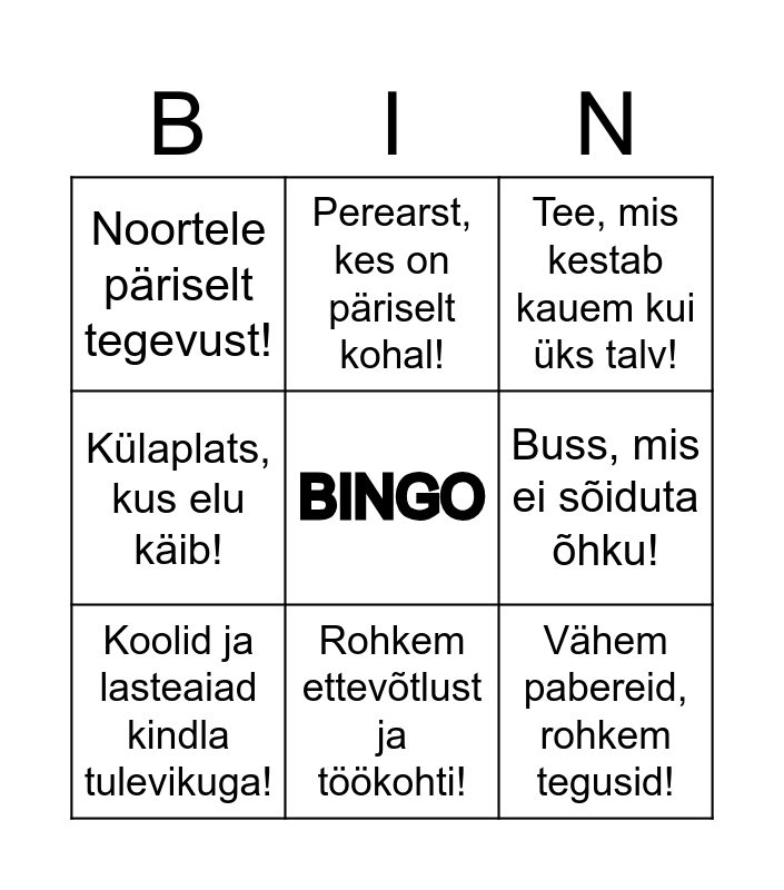 This bingo card has a free space and 8 words: Buss, mis ei sõiduta õhku!, Tee, mis kestab kauem kui üks talv!, Perearst, kes on päriselt kohal!, Koolid ja lasteaiad kindla tulevikuga!, Noortele päriselt tegevust!, Vähem pabereid, rohkem tegusid!, Külaplats, kus elu käib! and Rohkem ettevõtlust ja töökohti!.