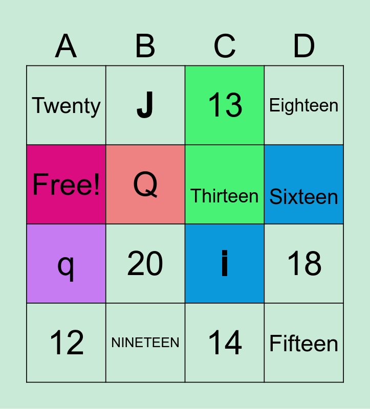 This bingo card has 36 words: Ten, Eleven, Twelve, Thirteen, Fourteen, Fifteen, Sixteen, 17, Free!, Seventeen, 18, Eighteen, 19, NINETEEN, 20, Twenty, 10, 11, 12, 13, 14, 15, 16, H, h, J, i, O, q, Q, S, C, U, u, w and Y.
