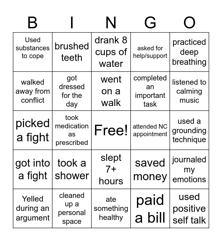 This bingo card has a free space and 24 words: Yelled during an argument, took a shower, went on a walk, paid a bill, practiced deep breathing, Used substances to cope, brushed teeth, drank 8 cups of water, attended NC appointment, used a grounding technique, picked a fight, got dressed for the day, saved money, journaled my emotions, walked away from conflict, cleaned up a personal space, ate something healthy, asked for help/support, listened to calming music, got into a fight, took medication as prescribed, slept 7+ hours, completed an important task and used positive self talk.