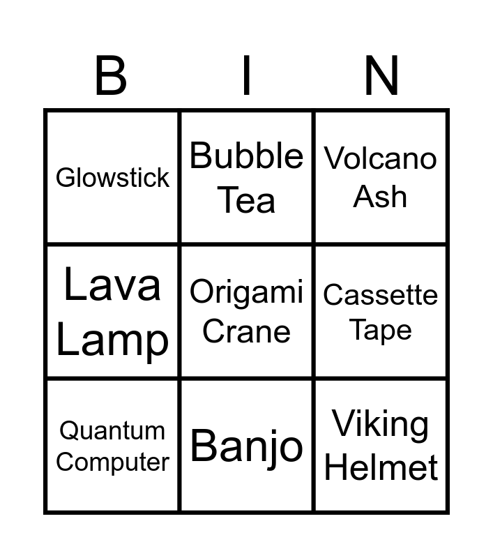 This bingo card has a free space and 8 words: Cassette Tape, Volcano Ash, Bubble Tea, Quantum Computer, Glowstick, Viking Helmet, Lava Lamp and Banjo.