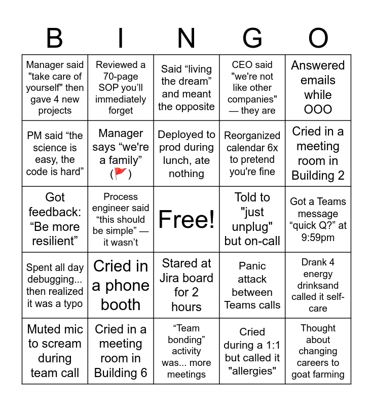 This bingo card has a free space and 24 words: Cried in a phone booth, Cried in a meeting room in Building 6, Deployed to prod during lunch, ate nothing, Muted mic to scream during team call, Answered emails while OOO, Manager said "take care of yourself" then gave 4 new projects, PM said “the science is easy, the code is hard”, Reviewed a 70-page SOP you’ll immediately forget, Told to "just unplug" but on-call, Stared at Jira board for 2 hours, Reorganized calendar 6x to pretend you're fine, Got feedback: “Be more resilient”, Panic attack between Teams calls, Drank 4 energy drinksand called it self-care, Manager says “we're a family” (🚩), Cried during a 1:1 but called it "allergies", Got a Teams message “quick Q?” at 9:59pm, Said “living the dream” and meant the opposite, Cried in a meeting room in Building 2, Process engineer said “this should be simple” — it wasn’t, Thought about changing careers to goat farming, Spent all day debugging... then realized it was a typo, CEO said "we're not like other companies" — they are and “Team bonding” activity was... more meetings.