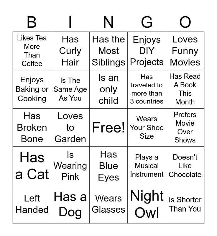 This bingo card has a free space and 24 words: Left Handed, Is Wearing Pink, Is an only child, Night Owl, Loves Funny Movies, Likes Tea More Than Coffee, Has Curly Hair, Has the Most Siblings, Wears Your Shoe Size, Prefers Movie Over Shows, Has Broken Bone, Is The Same Age As You, Plays a Musical Instrument, Doesn't Like Chocolate, Enjoys Baking or Cooking, Has a Dog, Wears Glasses, Enjoys DIY Projects, Has Read A Book This Month, Has a Cat, Loves to Garden, Has Blue Eyes, Has traveled to more than 3 countries and Is Shorter Than You.