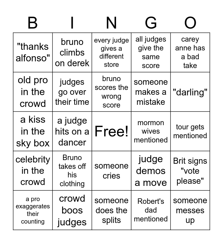 This bingo card has a free space and 24 words: Bruno takes off his clothing, crowd boos judges, bruno scores the wrong score, a pro exaggerates their counting, carey anne has a bad take, "thanks alfonso", old pro in the crowd, bruno climbs on derek, mormon wives mentioned, someone cries, someone makes a mistake, a kiss in the sky box, judge demos a move, Brit signs "vote please", judges go over their time, Robert's dad mentioned, tour gets mentioned, every judge gives a different store, "darling", a judge hits on a dancer, someone messes up, celebrity in the crowd, all judges give the same score and someone does the splits.