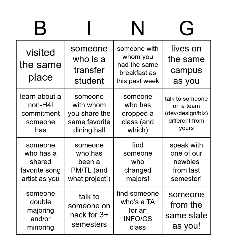 This bingo card has 16 words: talk to someone on hack for 3+ semesters, speak with one of our newbies from last semester!, someone with whom you had the same breakfast as this past week, visited the same place, someone who has a shared favorite song artist as you, someone who is a transfer student, find someone who changed majors!, find someone who’s a TA for an INFO/CS class, learn about a non-H4I commitment someone has, someone with whom you share the same favorite dining hall, someone double majoring and/or minoring, lives on the same campus as you, someone who has been a PM/TL (and what project!), talk to someone on a team (dev/design/biz) different from yours, someone who has dropped a class (and which) and someone from the same state as you!.