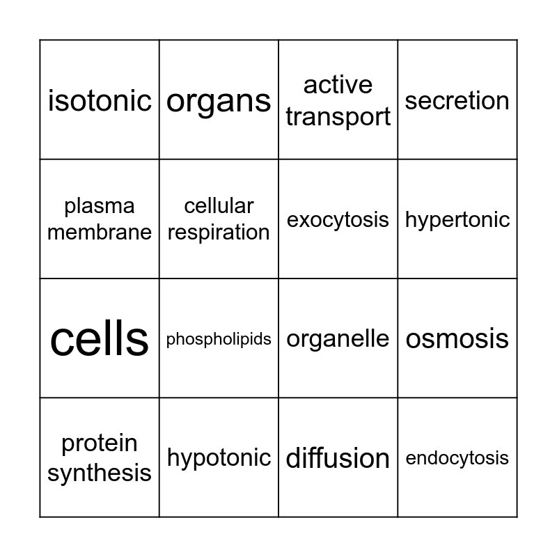 This bingo card has 16 words: hypotonic, osmosis, active transport, isotonic, cells, organs, organelle, diffusion, plasma membrane, cellular respiration, protein synthesis, secretion, phospholipids, hypertonic, exocytosis and endocytosis.