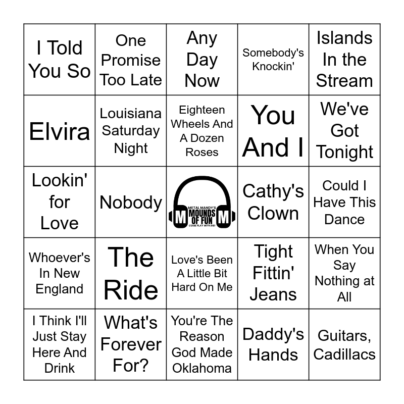 This bingo card has a free space and 75 words: All My Ex's Live In Texas, Angel Of The Morning, Any Day Now, Baby's Got Her Blue Jeans On, A Better Man, Born To Boogie, The Bluest Eyes In Texas, Copperhead Road, The Closer You Get, Diggin' Up Bones, Don't Close Your Eyes, Drivin' My Life Away, Eighteen Wheels And A Dozen Roses, Elvira, Does Fort Worth Ever Cross Your Mind, Nobody, Forever and Ever, Amen, Guitars, Cadillacs, I'll Still Be Loving You, Islands In the Stream, Killin' Time, Lookin' for Love, Louisiana Saturday Night, One Promise Too Late, Somebody's Knockin', I Wouldn't Have Missed It For The World, Mama He's Crazy, Meet Me In Montana, Mountain Music, Ocean Front Property, Stand By Me, Step By Step, Swingin', Tight Fittin' Jeans, We've Got Tonight, You And I, Why'd You Come in Here Lookin' Like That, Coal Miner's Daughter, Could I Have This Dance, Daddy's Hands, Dixieland Delight, The Fireman, Fool Hearted Memory, If You're Gonna Play in Texas, I Love a Rainy Night, I'm No Stranger to the Rain, I Think I'll Just Stay Here And Drink, I Told You So, I Was Country When Country Wasn't Cool, Lady, Love in the First Degree, Love's Been A Little Bit Hard On Me, On the Other Hand, On the Road Again, 80's Ladies, All My Rowdy Friends Are Coming Over Tonight, Pancho and Lefty, Queen Of Hearts, The Race Is On, Redneck Girl, The Ride, Rockin' With The Rhythm Of The Rain, Seven Year Ache, Slow Hand, Smoky Mountain Rain, Cathy's Clown, Somebody Should Leave, Through The Years, Two Dozen Roses, When You Say Nothing at All, Whoever's In New England, What's Forever For?, Why Not Me, You're The Reason God Made Oklahoma and I'd Just Love To Lay You Down.