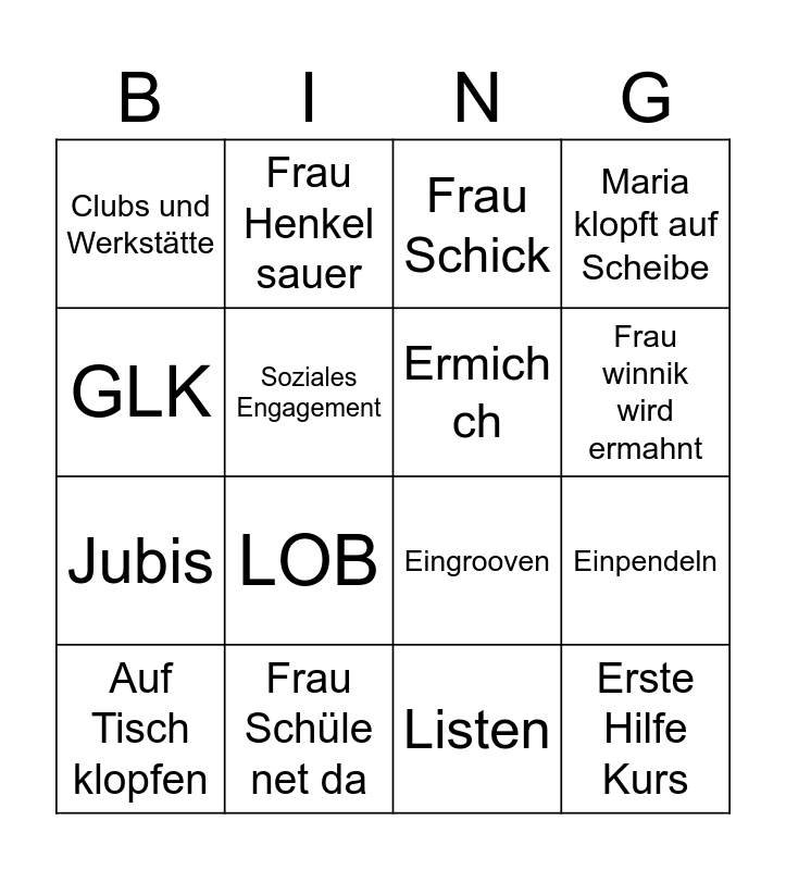This bingo card has 16 words: Frau Schüle net da, Einpendeln, Frau Schick, Clubs und Werkstätte, Jubis, Frau Henkel sauer, Eingrooven, Listen, GLK, Soziales Engagement, Auf Tisch klopfen, Maria klopft auf Scheibe, LOB, Frau winnik wird ermahnt, Ermich ch and Erste Hilfe Kurs.