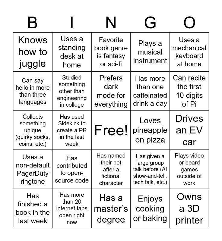 This bingo card has a free space and 25 words: Has contributed to open-source code, Has a master’s degree, Prefers dark mode for everything, Has finished a book in the last week, Uses a mechanical keyboard at home, Knows how to juggle, Can say hello in more than three languages, Uses a standing desk at home, Loves pineapple on pizza, Has named their pet after a fictional character, Has more than one caffeinated drink a day, Collects something unique (quirky socks, coins, etc.), Has given a large group talk before (AI show-and-tell, tech talk, etc.), Plays video or board games outside of work, Studied something other than engineering in college, Knows a programming joke that makes others groan, Drives an EV car, Favorite book genre is fantasy or sci-fi, Can recite the first 10 digits of Pi, Has used Sidekick to create a PR in the last week, Owns a 3D printer, Has more than 20 internet tabs open right now, Uses a non-default PagerDuty ringtone, Plays a musical instrument and Enjoys cooking or baking.