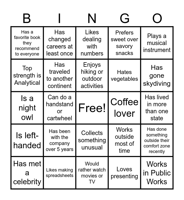 This bingo card has a free space and 39 words: Top strength is Relator, Lives outside of Goodyear, Drives a electric care, Has traveled to another continent, Has met a celebrity, Collects something unusual, Enjoys hiking or outdoor activities, Loves to cook or bake, Plays a musical instrument, Is left-handed, Can do a handstand or cartwheel, Prefers sweet over savory snacks, Works in Public Works, Has lived in more than one state, Coffee lover, Has been with the company over 5 years, Enjoys gardening, Has a favorite book they recommend to everyone, Has a favorite podcast, Works outside most of time, Top strength is Analytical, Would rather watch movies or TV, Hates vegetables, Has gone skydiving, Went on a vacation outside of AZ this summer, Loves spicy food, Knows how to knit or sew, Can juggle, Is an early riser, Has changed careers at least once, Likes organizing events or projects, Loves chocolate, Likes dealing with numbers, Likes making spreadsheets, Loves presenting, Has learned a new skill in the past year, Has done something outside their comfort zone recently, Is a night owl and Top strength is Strategic.