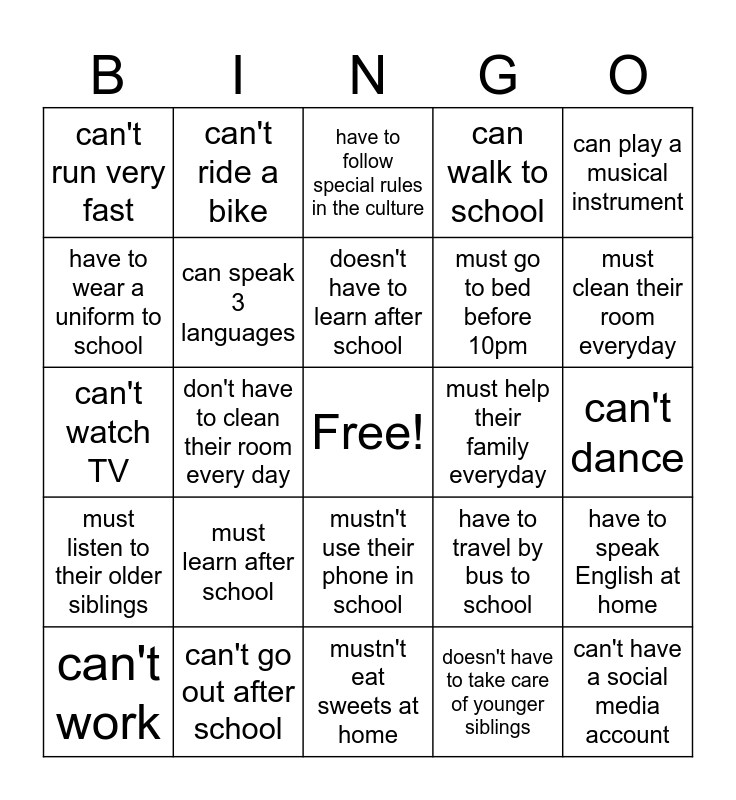 This bingo card has a free space and 24 words: must learn after school, can't go out after school, doesn't have to learn after school, can't work, can play a musical instrument, can't run very fast, have to wear a uniform to school, can't ride a bike, must help their family everyday, mustn't use their phone in school, must go to bed before 10pm, can't watch TV, have to travel by bus to school, have to speak English at home, can speak 3 languages, doesn't have to take care of younger siblings, can't dance, have to follow special rules in the culture, must clean their room everyday, don't have to clean their room every day, can't have a social media account, must listen to their older siblings, can walk to school and mustn't eat sweets at home.