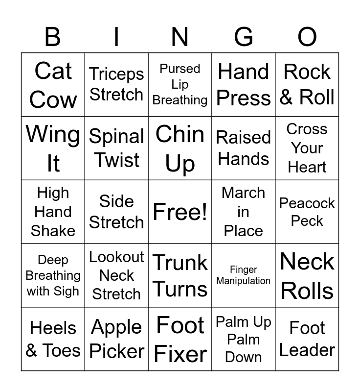 This bingo card has a free space and 24 words: Lookout Neck Stretch, Apple Picker, Chin Up, Heels & Toes, Rock & Roll, Cat Cow, Wing It, Triceps Stretch, March in Place, Trunk Turns, Raised Hands, High Hand Shake, Finger Manipulation, Neck Rolls, Spinal Twist, Palm Up Palm Down, Peacock Peck, Pursed Lip Breathing, Cross Your Heart, Side Stretch, Foot Leader, Deep Breathing with Sigh, Hand Press and Foot Fixer.