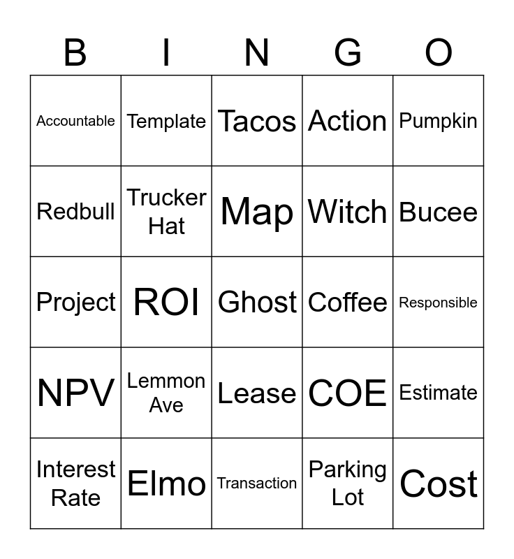 This bingo card has 25 words: Lemmon Ave, Transaction, Map, Interest Rate, Pumpkin, Accountable, Redbull, Template, Coffee, Lease, Witch, Project, COE, Estimate, Trucker Hat, Cost, Responsible, Tacos, Bucee, ROI, Ghost, Elmo, NPV, Action and Parking Lot.