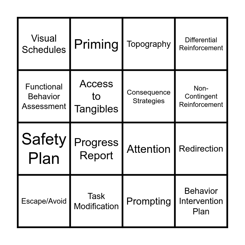 This bingo card has 24 words: First Then, Behavior, Prompting, Behavior Intervention Plan, Visual Schedules, Priming, Consequence Strategies, Differential Reinforcement, Safety Plan, Task Modification, A-B-C, Non-Contingent Reinforcement, Function, Ecological Strategies, Attention, Antecedent Strategies, Escape/Avoid, Access to Tangibles, Providing Choices, Redirection, Functional Behavior Assessment, Progress Report, Topography and Sensory.