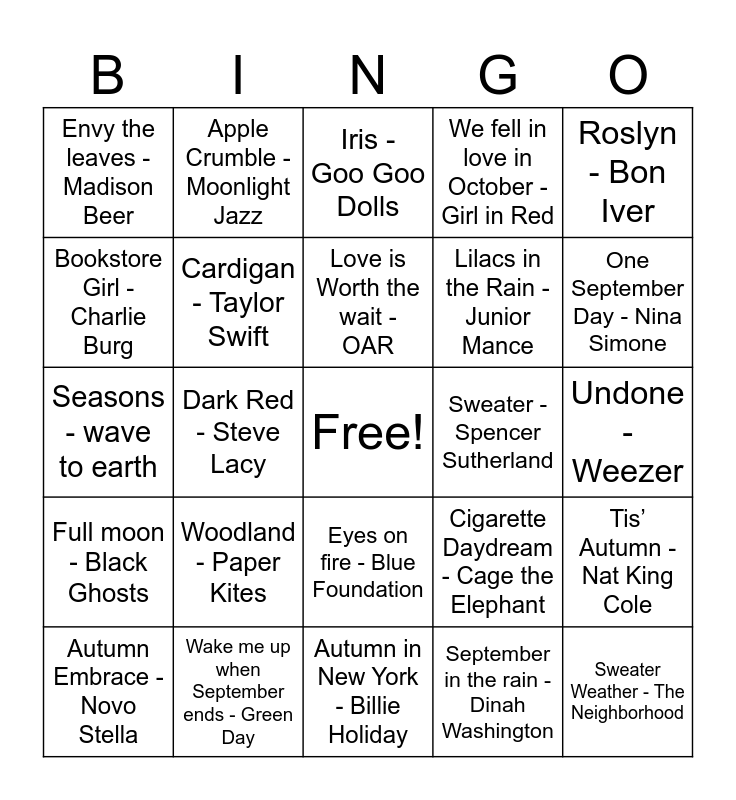 This bingo card has a free space and 41 words: September - Earth Wind and Fire, Seasons - wave to earth, Apple Cider - beabadoobee, Cardigan - Taylor Swift, Wake me up when September ends - Green Day, Eyes on fire - Blue Foundation, Love is Worth the wait - OAR, Decode - Paramore, Roslyn - Bon Iver, Full moon - Black Ghosts, Dark Red - Steve Lacy, We fell in love in October - Girl in Red, Sweater Weather - The Neighborhood, Undone - Weezer, Sweater - Spencer Sutherland, Woodland - Paper Kites, Flowers in the Window - Travis, Envy the leaves - Madison Beer, Dream Girl Evil - Florence + the machine, Iris - Goo Goo Dolls, Tis’ Autumn - Nat King Cole, Sunrise - Norah Jones, Autumn in New York - Billie Holiday, Lilacs in the Rain - Junior Mance, Your mine, You - Chet Baker, September of my Years - Frank Sinatra, September in the rain - Dinah Washington, Maybe September - Tony Bennett, One September Day - Nina Simone, Early Autumn - Ella Fitzgerald, Autumn Leaves - Nat King Cole, Apple Crumble - Moonlight Jazz, Autumn Embrace - Novo Stella, Moon Song - Phoebe Bridgers, Cigarette Daydream - Cage the Elephant, Bookstore Girl - Charlie Burg, Moonlight on the river - Mac Demarco, Landslide- Fleetwood Mac, Apples, Peaches, pumpkin - Jay and the Techinques, Georgia on my mind - Ray Charles and Fade into you - Mazzy Star.