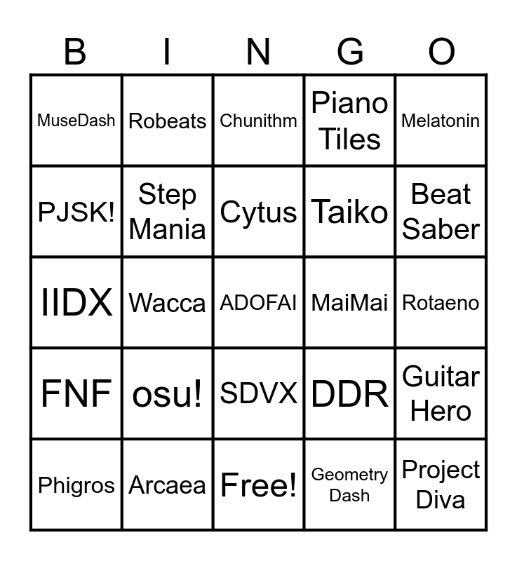 This bingo card has a free space and 24 words: osu!, Arcaea, Cytus, Phigros, Melatonin, MuseDash, PJSK!, Robeats, MaiMai, SDVX, Taiko, IIDX, DDR, Guitar Hero, Step Mania, Geometry Dash, Rotaeno, Chunithm, Beat Saber, Wacca, Project Diva, FNF, Piano Tiles and Free!.